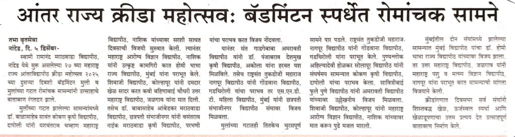 क्रीडा महोत्सव: बॅडमिंटन स्पर्धेत रोमांचक सामने स्वामी रामानंद मराठवाडा विद्यापीठ, नांदेड येथे सुरू असलेल्या २७ व्या महाराष्ट्र राज्य आंतरविद्यापीठ क्रीडा महोत्सव २०२५ च्या दुसऱ्या दिवशी बॅडमिंटन मुली व मुलांच्या गटात रोमांचक सामन्यांनी उत्साहाचे वातावरण रंगतदार झाले. मुलींच्या गटात झालेल्या सामन्यांमध्ये डॉ. बाळासाहेब सावंत कोकण कृषी विद्यापीठ, दापोली यांनी यशवंतराव चव्हाण महाराष्ट्र विद्यापीठ, नाशिक यांच्यावर सरशी साधत दिवसाची विजयी सुरुवात केली. त्यानंतर महाराष्ट्र आरोग्य विज्ञान विद्यापीठ, नाशिक यांनी उत्कृष्ट कामगिरी करत होमी भाभा राज्य विद्यापीठ, मुंबई यांना पराभूत केले. शिवाजी विद्यापीठ, कोल्हापूर यांनी दमदार खेळ सादर करत कवी बहिणाबाई चौधरी उत्तर महाराष्ट्र विद्यापीठ, जळगाव यांना मात दिली. तसेच डॉ. बाबासाहेब आंबेडकर मराठवाडा विद्यापीठ, छत्रपती संभाजीनगर यांनी वसंतराव नाईक मराठवाडा कृषी विद्यापीठ, परभणी यांचा पराभव करत विजय नोंदवला. यानंतर संत गाडगेबाबा अमरावती विद्यापीठ यांनी डॉ. पंजाबराव देशमुख कृषी विद्यापीठ, अकोला यांना हरवत यश मिळविले. तसेच राष्ट्रसंत तुकडोजी महाराज नागपूर विद्यापीठ यांनी गोंडवाना विद्यापीठ, गडचिरोली यांचा पराभव तर एस.एन.डी.टी. महिला विद्यापीठ, मुंबई यांनी छत्रपती संभाजीनगर विद्यापीठ संघावर विजय मिळवला. मुलांच्या गटातही तितकेच चुरसपूर्ण सामने पार पडले. राष्ट्रसंत तुकडोजी महाराज नागपूर विद्यापीठ यांनी गोंडवाना विद्यापीठ, गडचिरोली यांना पराभूत केले. पुण्यश्लोक अहिल्यादेवी होळकर सोलापूर विद्यापीठ यांनी संघर्षमय सामन्यात कोकण कृषी विद्यापीठ, दापोली यांचा पराभव केला. सावित्रीबाई फुले पुणे विद्यापीठ यांनी अमरावती विद्यापीठ यांच्यावर उल्लेखनीय विजय मिळवला. शिवाजी विद्यापीठ, कोल्हापूर यांनी महाराष्ट्र आरोग्य विज्ञान विद्यापीठ, नाशिक यांच्यावर मात करून पुढे मजल मारली. मुंबईतील दोन संघांमध्ये झालेल्या सामन्यात मुंबई विद्यापीठ यांचा डॉ. होमी भाभा राज्य विद्यापीठ यांच्यावर विजय झाला. तर उत्तर महाराष्ट्र विद्यापीठ, जळगाव यांनी महाराष्ट्र पशु व मत्स्य विज्ञान विद्यापीठ, नागपूर यांना पराभूत करत सामन्याची सांगता विजयाने केली. क्रीडांगणात दिवसभर सर्व संघांनी शिस्तबद्ध खेळ, ऊर्जस्वल स्पर्धा आणि खेळाडूपणाचा उत्तम प्रत्यय देत उत्साहपूर्ण वातावरण निर्माण केले.