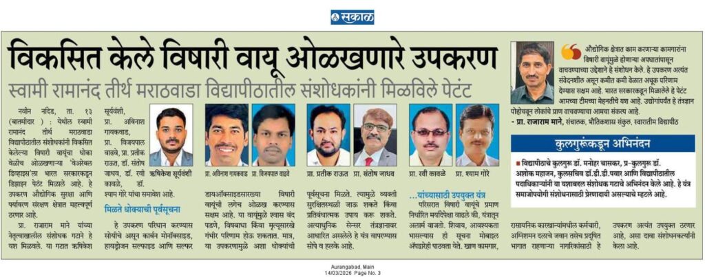 प्रो. राजाराम माने यांच्या संशोधन टीमच्या ‘विषारी वायू शोधक’ उपकरणाला केंद्र सरकारचे पेटंट स्वामी रामानंद तीर्थ मराठवाडा विद्यापीठातील संशोधन टीमचा बहुमान स्वामी रामानंद तीर्थ मराठवाडा विद्यापीठातील भौतिकशास्त्र संकुलाचे संचालक आंतरराष्ट्रीय कीर्तीचे शास्त्रज्ञ प्रा. डॉ. राजाराम माने व त्यांच्या संशोधन टीमने औद्योगिक क्षेत्रासाठी अत्यंत उपयुक्त असे ‘टॉक्सिक गॅस मॉनिटरिंग वेअरेबल डिव्हाइस’ (Toxic Gas Monitoring Wearable Device) विकसित केले असून या उपकरणाला भारत सरकारच्या पेटंट कार्यालयाकडून अधिकृत नोंदणी प्रमाणपत्र (डिझाईन पेटंट) प्राप्त झाले आहे. हे उपकरण औद्योगिक वसाहती, रासायनिक प्रयोगशाळा तसेच धोकादायक वातावरणात काम करणाऱ्या कर्मचाऱ्यांच्या सुरक्षेसाठी विकसित करण्यात आले आहे. कामाच्या ठिकाणी विषारी वायूंची पातळी वाढल्यास हे उपकरण त्वरित इशारा (अलर्ट) देऊन संभाव्य अपघात टाळण्यास मदत करणार आहे. त्यामुळे कामगारांच्या सुरक्षिततेसाठी हे उपकरण ‘स्मार्ट सुरक्षा कवच’ ठरणार असल्याचे संशोधकांनी सांगितले. या संशोधन प्रकल्पात प्रा. डॉ. राजाराम माने यांच्या मार्गदर्शनाखाली अविनाश गायकवाड, ऋषिकेश सूर्यवंशी, विजयपाल वाधवे, प्रतीक राऊत, तेजश्री साठे यांच्यासह डॉ. रुपेश मुद्देवाड, डॉ. रवी कवळे, डॉ. संतोष जाधव आणि डॉ. श्याम गोरे यांनी मोलाचे योगदान दिले आहे. या उल्लेखनीय यशाबद्दल विद्यापीठाचे कुलगुरू डॉ. मनोहर चासकर, प्र-कुलगुरू डॉ. अशोक महाजन, कुलसचिव डॉ. ज्ञानेश्वर पवार यांनी संशोधन टीमचे अभिनंदन केले. तसेच अधिष्ठाता डॉ. एम. के. पाटील, डॉ. पराग खडके, डॉ. हरिश्चंद्र पतंगे, डॉ. चंद्रकांत बाविस्कर यांच्यासह विद्यापीठातील विविध संकुलाचे संचालक, प्राध्यापक, अधिकारी व कर्मचाऱ्यांनी संशोधनाचे कौतुक करून संशोधक टीमला शुभेच्छा दिल्या.