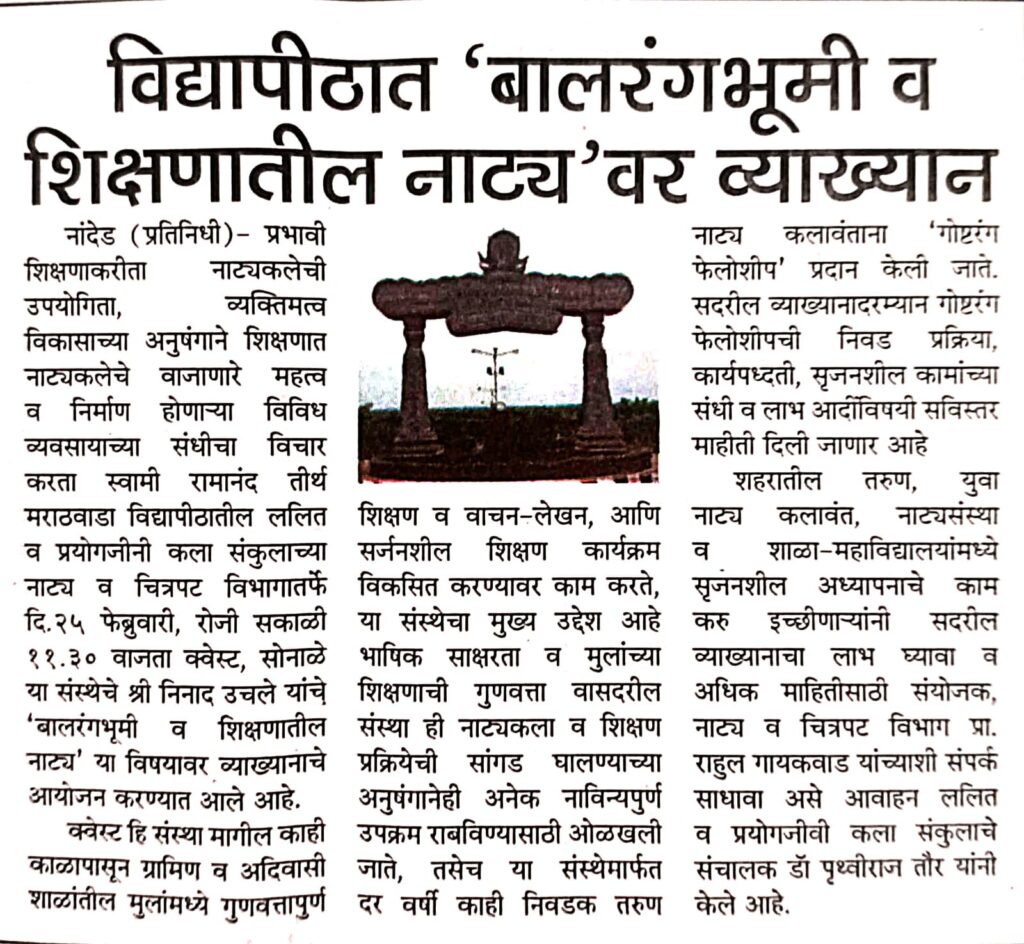 विद्यापीठात ‘बालरंगभूमी व शिक्षणातील नाट्य’ विषयावर व्याख्यानाचे आयोजन प्रभावी शिक्षणाकरीता नाट्यकलेची उपयोगिता, व्यक्तिमत्व विकासाच्या अनुषंगाने शिक्षणात नाट्यकलेचे वाढत जाणारे महत्व व निर्माण होणाऱ्या विविध व्यवसायाच्या संधीचा विचार करता स्वामी रामानंद तीर्थ मराठवाडा विद्यापीठातील ललित व प्रयोगजीनी कला संकुलाच्या नाट्य व चित्रपट विभागातर्फे दि.२५ फेब्रुवारी, २०२६ रोजी सकाळी ११.३० वाजता क्वेस्ट, सोनाळे (Quality Education Support Trust) या संस्थेचे श्री निनाद उचले यांचे ‘बालरंगभूमी व शिक्षणातील नाट्य’ या विषयावर व्याख्यानाचे आयोजन करण्यात आले आहे. क्वेस्ट हि संस्था मागील काही काळापासून ग्रामिण व अदिवासी शाळांतील मुलांमध्ये गुणवत्तापुर्ण शिक्षण व वाचन-लेखन, आणि सर्जनशील शिक्षण कार्यक्रम विकसित करण्यावर काम करते, या संस्थेचा मुख्य उद्देश आहे भाषिक साक्षरता व मुलांच्या शिक्षणाची गुणवत्ता वाढवणे. सदरील संस्था ही नाट्यकला व शिक्षण प्रक्रियेची सांगड घालण्याच्या अनुषंगानेही अनेक नाविन्यपुर्ण उपक्रम राबविण्यासाठी ओळखली जाते, तसेच या संस्थेमार्फत दर वर्षी काही निवडक तरुण नाट्य कलावंताना ‘गोष्टरंग फेलोशीप’ प्रदान केली जाते. सदरील व्याख्यानादरम्यान गोष्टरंग फेलोशीपची निवड प्रक्रिया, कार्यपध्दती, सृजनशील कामांच्या संधी व लाभ आदींविषयी सविस्तर माहीती दिली जाणार आहे शहरातील तरुण, युवा नाट्य कलावंत, नाट्यसंस्था व शाळा-महाविद्यालयांमध्ये सृजनशील अध्यापनाचे काम करु इच्छीणाऱ्यांनी सदरील व्याख्यानाचा लाभ घ्यावा व अधिक माहितीसाठी संयोजक, नाट्य व चित्रपट विभाग प्रा. राहुल गायकवाड यांच्याशी संपर्क साधावा असे आवाहन ललित व प्रयोगजीवी कला संकुलाचे संचालक डॅा पृथ्वीराज तौर यांनी केले आहे.