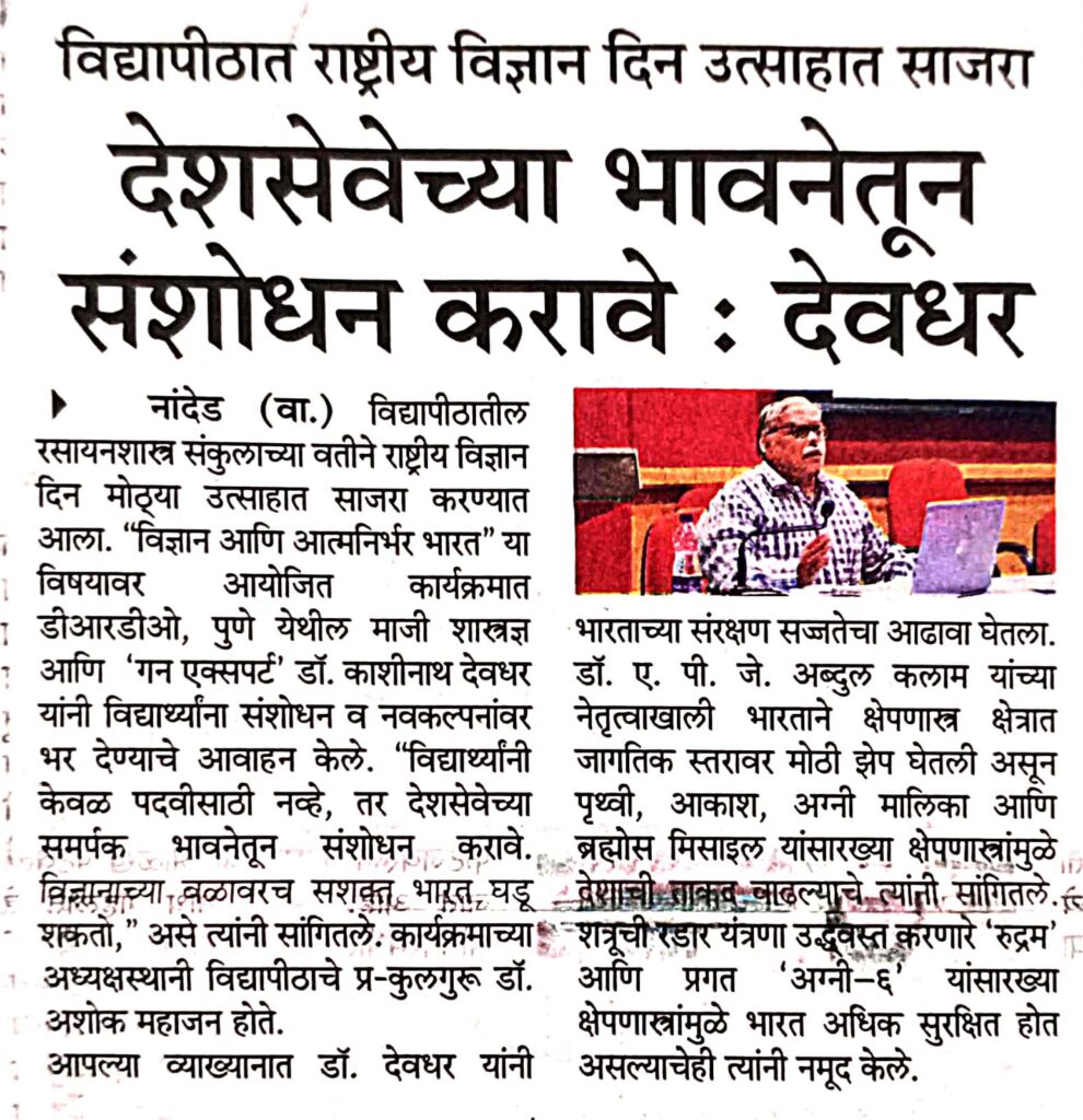 स्वामी रामानंद तीर्थ मराठवाडा विद्यापीठात राष्ट्रीय विज्ञान दिन उत्साहात संपन्न “विद्यार्थ्यांनी केवळ पदवीसाठी नव्हे, तर देशसेवेच्या समर्पक भावनेतून संशोधन आणि नवकल्पनांवर भर द्यावा. विज्ञानाच्या बळावरच आपण समर्थ आणि सशक्त भारत घडवू शकतो.” असे प्रतिपादन डॉ. काशीनाथ देवधर यांनी केले. स्वामी रामानंद तीर्थ मराठवाडा विद्यापीठातील रसायनशास्त्र संकुलाच्या वतीने ‘राष्ट्रीय विज्ञान दिन’ मोठ्या उत्साहात साजरा करण्यात आला. “विज्ञान आणि आत्मनिर्भर भारत” या विषयावर आयोजित या विशेष कार्यक्रमात प्रमुख वक्ते म्हणून डीआरडीओ (DRDO) पुणे येथील माजी शास्त्रज्ञ आणि सुप्रसिद्ध ‘गन एक्सपर्ट’ डॉ. काशीनाथ देवधर उपस्थित होते. कार्यक्रमाच्या अध्यक्षस्थानी विद्यापीठाचे प्र-कुलगुरू डॉ. अशोक महाजन होते. आपल्या अभ्यासपूर्ण व्याख्यानात डॉ. देवधर यांनी भारताच्या संरक्षण सज्जतेचा आढावा घेतला. ते म्हणाले की, “डॉ. ए.पी.जे. अब्दुल कलाम यांच्या नेतृत्वाखाली भारताने क्षेपणास्त्र क्षेत्रात जागतिक स्तरावर आपला ठसा उमटवला आहे. पृथ्वी, आकाश, अग्नी मालिका आणि ब्रह्मोस सारख्या क्षेपणास्त्रांमुळे आपली ताकद वाढली आहे. शत्रूची रडार यंत्रणा उद्ध्वस्त करणारे ‘रुद्रम’ आणि प्रगत ‘अग्नी-६’ मुळे भारत आता अधिक सुरक्षित आहे.” डॉ. देवधर यांनी आपल्या कारकिर्दीतील महत्त्वाचे अनुभव विद्यार्थ्यांना सांगितले. डॉ. कलाम यांच्या मार्गदर्शनाखाली प्रत्यक्ष कारगिल युद्धाच्या काळात काम करण्याची संधी मिळणे, हा आयुष्यातील अमूल्य ठेवा असल्याचे त्यांनी सांगितले. भारतीय जवानांच्या सुविधेसाठी ‘जी बजुका’ गनचे वजन २६ किलोवरून १४ किलोपर्यंत कमी करण्याचे महत्त्वपूर्ण कार्य त्यांच्या हातून घडले, ज्याचा त्यांना सार्थ अभिमान आहे. संरक्षण सिद्धतेवर आतापर्यंत १०३१ हून अधिक व्याख्याने देऊन त्यांनी तरुणांमध्ये राष्ट्रप्रेमाची ज्योत पेटवली आहे. या प्रसंगी व्यासपीठावर विज्ञान व तंत्रज्ञान अधिष्ठाता डॉ. एम. के. पाटील, डॉ. शैलेश वाढेर, रसायनशास्त्र संकुल संचालक डॉ. संगीता माकोने, समन्वयक डॉ. अविनाश पुयड यांची प्रमुख उपस्थिती होती. या कार्यक्रमाला डॉ. ज्ञानेश्वर वानखेडे, डॉ. चैतन्या, डॉ. सुहास पाठक, डॉ. गट्टानी, डॉ. पेकमवार, डॉ. यशवंत जोशी यांच्यासह मोठ्या संख्येने प्राध्यापक, संशोधक व विद्यार्थी उपस्थित होते. डॉ. संगीता माकोने यांच्या मार्गदर्शनाखाली या सोहळ्याचे नेटके नियोजन करण्यात आले होते. कार्यक्रमाच्या शेवटी प्रमुख पाहुणे डॉ. काशीनाथ देवधर यांचा विद्यापीठाच्या वतीने विशेष सत्कार करण्यात आला.