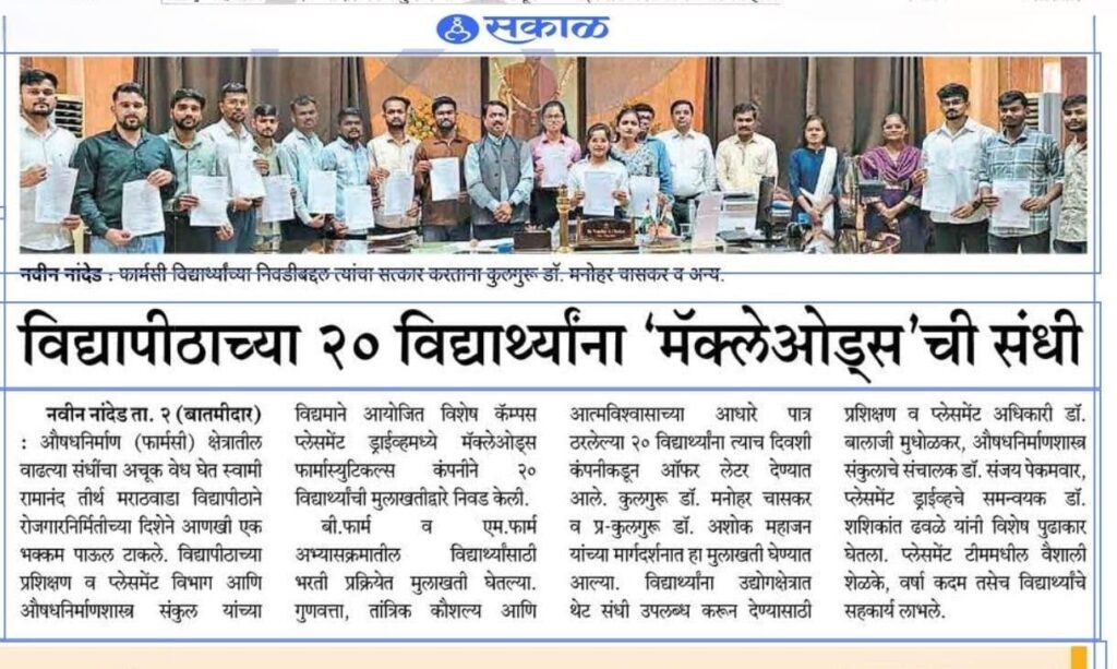 स्वामी रामानंद तीर्थ मराठवाडा विद्यापीठाच्या शिरपेचात मानाचा तुरा; २० फार्मसी विद्यार्थ्यांची मॅक्लेओड्स फार्मास्युटिकल्समध्ये निवड औषधनिर्माण (फार्मसी) क्षेत्रातील वाढती मागणी आणि उद्योगक्षेत्राशी सुसंगत शिक्षण यांची प्रभावी सांगड घालत स्वामी रामानंद तीर्थ मराठवाडा विद्यापीठाने रोजगारनिर्मितीच्या दिशेने आणखी एक उल्लेखनीय पाऊल टाकले आहे. विद्यापीठाच्या प्रशिक्षण व प्लेसमेंट विभाग आणि औषधनिर्माणशास्त्र संकुल यांच्या संयुक्त विद्यमाने आयोजित विशेष कॅम्पस प्लेसमेंट ड्राईव्हमध्ये औषधनिर्मिती क्षेत्रातील नामांकित कंपनी मॅक्लेओड्स फार्मास्युटिकल्सने २० विद्यार्थ्यांची प्रत्यक्ष मुलाखतीद्वारे निवड केली. हा यशस्वी उपक्रम कुलगुरू डॉ. मनोहर चासकर आणि प्र-कुलगुरू डॉ. अशोक महाजन यांच्या मार्गदर्शनाखाली पार पडला. बी.फार्म आणि एम.फार्म अभ्यासक्रमातील विद्यार्थ्यांसाठी ही विशेष भरती प्रक्रिया आयोजित करण्यात आली होती. दिवसभर चाललेल्या मुलाखतीनंतर पात्र ठरलेल्या २० विद्यार्थ्यांना त्याच दिवशी कंपनीच्या वतीने ऑफर लेटर प्रदान करण्यात आले. विद्यार्थ्यांना नामांकित औषधनिर्माण कंपनीत करिअरची सुवर्णसंधी उपलब्ध करून देण्यासाठी प्रशिक्षण व प्लेसमेंट अधिकारी डॉ. बालाजी मुधोळकर, औषधनिर्माणशास्त्र संकुलाचे संचालक डॉ. संजय पेकमवार आणि प्लेसमेंट ड्राईव्हचे समन्वयक डॉ. शशिकांत ढवळे यांनी विशेष पुढाकार घेतला. प्लेसमेंट टीममधील वैशाली शेळके, वर्षा कदम तसेच उपस्थित विद्यार्थ्यांनीही या मोहिमेच्या यशस्वीतेसाठी परिश्रम घेतले. निवड झालेल्या सर्व विद्यार्थ्यांचे अभिनंदन करत कुलगुरू डॉ. मनोहर चासकर आणि प्र-कुलगुरू डॉ. अशोक महाजन यांनी त्यांच्या उज्ज्वल भविष्यासाठी शुभेच्छा दिल्या. या यशामुळे औषधनिर्माणशास्त्र संकुलाच्या शैक्षणिक गुणवत्तेचा आणि उद्योगाभिमुख शिक्षण पद्धतीचा पुन्हा एकदा प्रत्यय आला असून विद्यापीठाच्या शिरपेचात मानाचा तुरा रोवला गेला आहे. या निवडीमुळे संकुलात आनंदाचे वातावरण निर्माण झाले असून भविष्यातही अशा प्रकारच्या उद्योग-संलग्न उपक्रमांद्वारे विद्यार्थ्यांना अधिकाधिक संधी उपलब्ध करून देण्याचा विद्यापीठाचा मानस आहे.