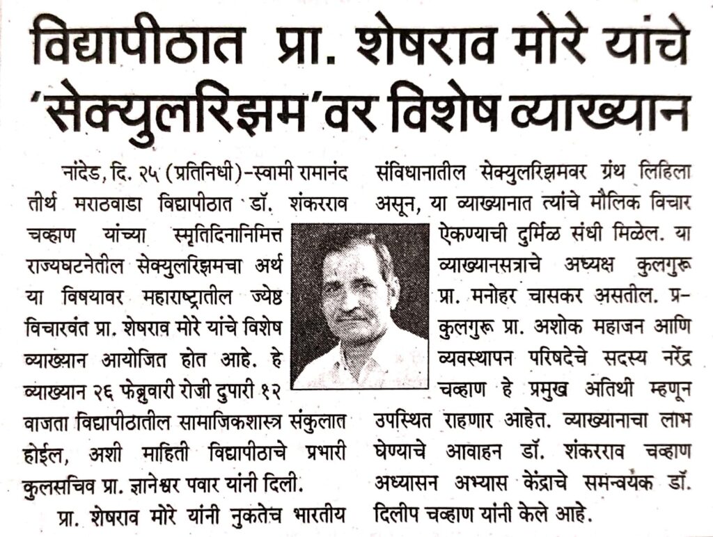 ‘स्वारातीम” विद्यापीठात ‘सेक्युलरिझम’वर विशेष व्याख्यान स्वामी रामानंद तीर्थ मराठवाडा विद्यापीठात डॉ. शंकरराव चव्हाण यांच्या स्मृतिदिनानिमित्त ‘राज्यघटनेतील सेक्युलरिझमचा अर्थ’ या विषयावर महाराष्ट्रातील ज्येष्ठ विचारवंत प्रा. शेषराव मोरे यांचे विशेष व्याख्यान आयोजित होत आहे. हे व्याख्यान दि.२६ फेब्रुवारी, २०२६ रोजी दुपारी १२ वाजता विद्यापीठातील सामाजिकशास्त्र संकुलात होईल, अशी माहिती विद्यापीठाचे प्रभारी कुलसचिव प्रा. ज्ञानेश्वर पवार यांनी दिली. प्रा. शेषराव मोरे यांनी नुकतेच भारतीय संविधानातील सेक्युलरिझमवर ग्रंथ लिहिला असून, या व्याख्यानात त्यांचे मौलिक विचार ऐकण्याची दुर्मीळ संधी मिळेल. या व्याख्यानसत्राचे अध्यक्ष विद्यापीठाचे कुलगुरू प्रा. मनोहर चासकर असतील. प्र-कुलगुरू प्रा. अशोक महाजन आणि व्यवस्थापन परिषदेचे सदस्य नरेंद्र चव्हाण हे प्रमुख अतिथी म्हणून उपस्थित राहणार आहेत. सर्वांनी या व्याख्यानाचा लाभ घेण्याचे आवाहन डॉ. शंकरराव चव्हाण अध्यासन अभ्यास केंद्राचे समन्वयक डॉ. दिलीप चव्हाण यांनी केले आहे.