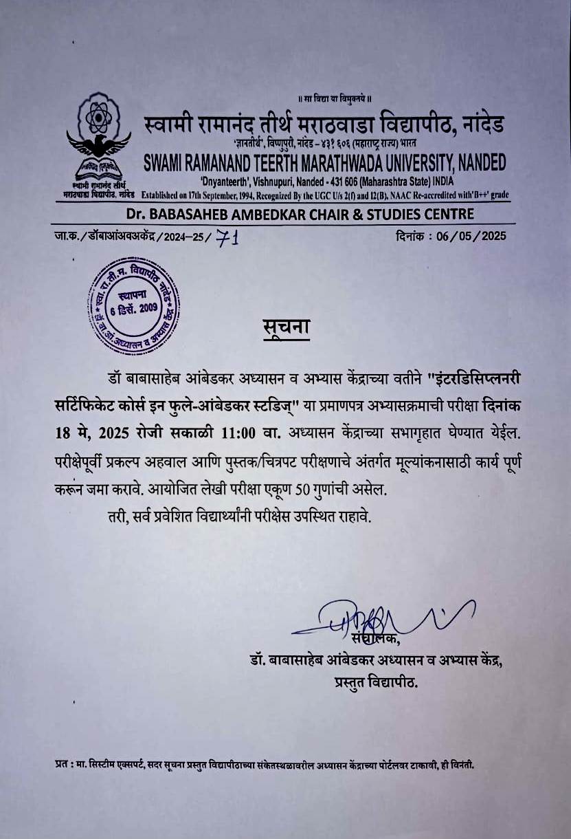 "इंटरडिसिप्लनरी सर्टिफिकेट कोर्स इन फुले-आंबेडकर स्टडिज्" या प्रमाणपत्र अभ्यासक्रमाची सूचना ...