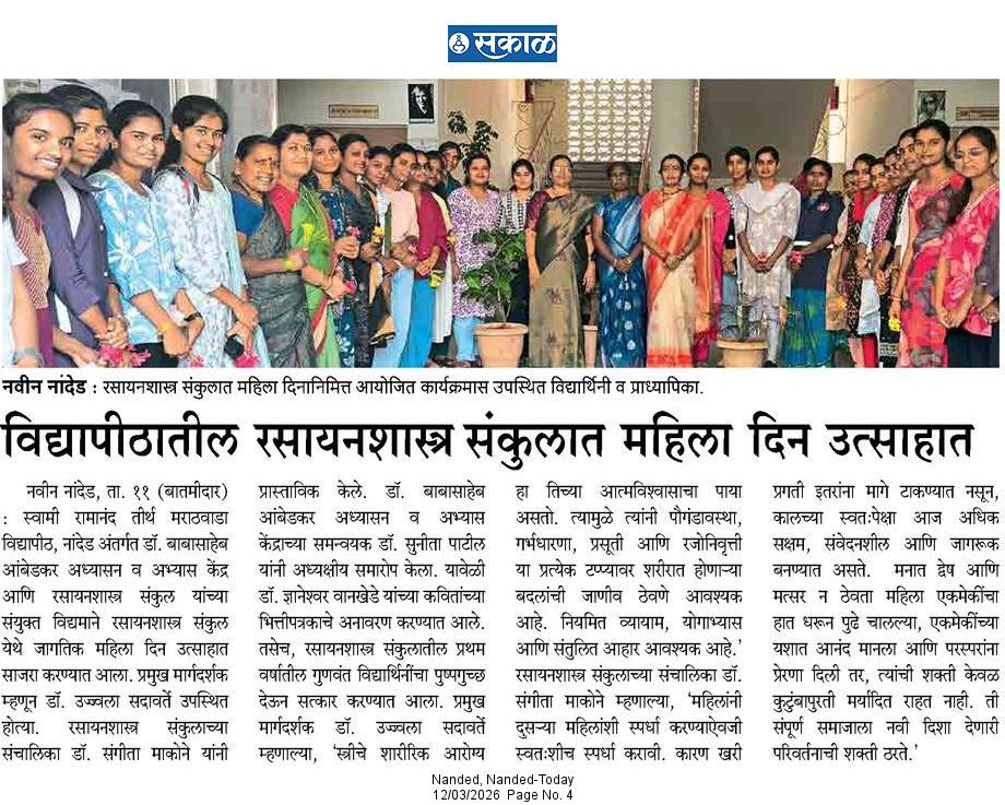 स्त्रीचे आरोग्य हाच तिच्या आत्मविश्वासाचा पाया : डॉ. उज्वला सदावर्ते स्वामी रामानंद तीर्थ मराठवाडा विद्यापीठात जागतिक महिला दिन उत्साहात साजरा स्वामी रामानंद तीर्थ मराठवाडा विद्यापीठातील डॉ. बाबासाहेब आंबेडकर अध्यासन व अभ्यास केंद्र आणि रसायनशास्त्र संकुल यांच्या संयुक्त विद्यमाने जागतिक महिला दिन उत्साहात साजरा करण्यात आला. या कार्यक्रमासाठी प्रमुख वक्त्या म्हणून प्रसिद्ध व्याख्यात्या डॉ. उज्वला सदावर्ते उपस्थित होत्या. कार्यक्रमात मार्गदर्शन करताना डॉ. उज्वला सदावर्ते यांनी महिलांच्या शारीरिक व मानसिक आरोग्याच्या महत्त्वावर विशेष भर दिला. त्या म्हणाल्या की, स्त्रीचे शारीरिक आरोग्य हा तिच्या आत्मविश्वासाचा पाया असतो. पौगंडावस्था ते रजोनिवृत्तीपर्यंत शरीरात होणारे बदल समजून घेत महिलांनी स्वतःच्या आरोग्याकडे लक्ष देणे आवश्यक आहे. व्यायाम आणि संतुलित आहार हा पर्याय नसून जीवनाचा आवश्यक भाग आहे, असे त्यांनी सांगितले. महिलांच्या बहुआयामी भूमिकांवर भाष्य करताना त्यांनी सांगितले की, स्त्रीने सर्व नातेसंबंधांच्या पलीकडे जाऊन स्वतःला स्वतंत्र व्यक्ती म्हणून ओळखले पाहिजे. स्वतःचे छंद जोपासावेत आणि कोणतेही काम ओझे न समजता आनंदी वृत्तीने करावे, असा सल्लाही त्यांनी दिला. यावेळी त्यांनी स्वरचित कविता, गीते आणि भारुड सादर करून उपस्थितांचे प्रबोधन केले. कार्यक्रमाच्या प्रास्ताविकात रसायनशास्त्र संकुलाच्या संचालिका डॉ. संगीता माकोने यांनी महिला सक्षमीकरणाबाबत आपले विचार मांडले. महिलांनी एकमेकींशी स्पर्धा करण्याऐवजी स्वतःशीच स्पर्धा करावी. परस्पर सहकार्य आणि एकजूट हीच महिलांची खरी ताकद असून ती समाजाला सकारात्मक दिशा देणारी ठरते, असे त्या म्हणाल्या. या कार्यक्रमाच्या निमित्ताने दोन विशेष उपक्रम राबवण्यात आले. काव्य दर्शन या उपक्रमांतर्गत डॉ. ज्ञानेश्वर वानखेडे यांच्या कवितांच्या भित्तीपत्रकाचे मान्यवरांच्या हस्ते उद्घाटन करण्यात आले. तसेच रसायनशास्त्र संकुलातील प्रथम वर्षातील गुणवंत विद्यार्थिनींचा पुष्पगुच्छ देऊन सत्कार करण्यात आला. कार्यक्रमाचे आभार प्रदर्शन डॉ. बाबासाहेब आंबेडकर अध्यासन व अभ्यास केंद्राच्या समन्वयक डॉ. सुनिता पाटील यांनी केले. या कार्यक्रमाला रसायनशास्त्र संकुलातील प्राध्यापक, कर्मचारी आणि विद्यार्थिनी मोठ्या संख्येने उपस्थित होत्या.