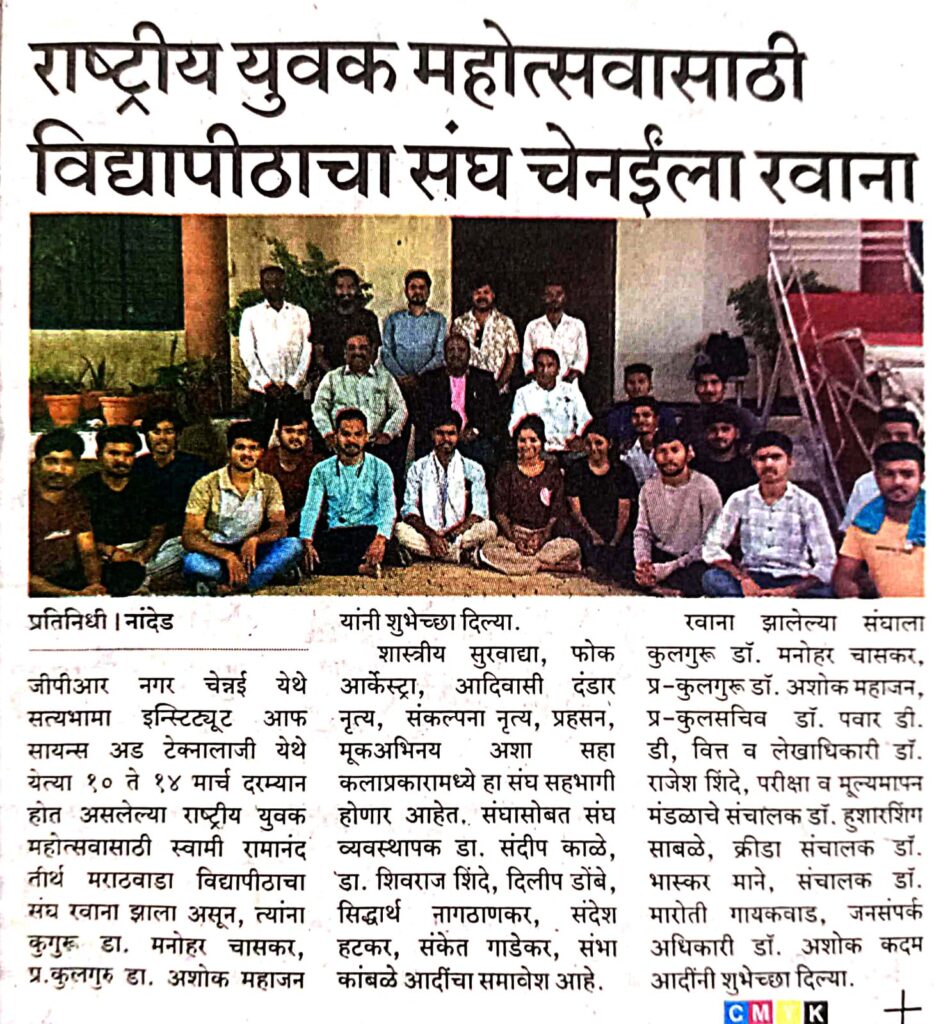 स्वारातीम’ विद्यापीठाचा संघ राष्ट्रीय युवक महोत्सवासाठी चेन्नईला रवाना भारतीय विद्यापीठ महासंघ (AIU) यांच्या वतीने आयोजित ३९ व्या आंतरविद्यापीठ राष्ट्रीय युवक महोत्सवात (UNIFEST) सहभागी होण्यासाठी स्वामी रामानंद तीर्थ मराठवाडा विद्यापीठाचा संघ चेन्नईकडे रवाना झाला आहे. हा महोत्सव १० ते १४ मार्च, २०२६ दरम्यान तमिळनाडूतील चेन्नई येथील सत्यभामा इन्स्टिट्यूट ऑफ सायन्स अँड टेक्नॉलॉजी येथे होणार आहे. या प्रतिष्ठेच्या राष्ट्रीय महोत्सवात विद्यापीठाचा संघ सहा विविध कलाप्रकारांमध्ये आपले कौशल्य सादर करणार आहे. यात शास्त्रीय सूरवाद्य, फोक आर्केस्ट्रा, आदिवासी दंडार नृत्य, संकल्पना नृत्य, प्रहसन (Skit) आणि मूकअभिनय (Mime) या स्पर्धांचा समावेश आहे. या माध्यमातून मराठवाड्याची कला राष्ट्रीय स्तरावर सादर होणार आहे. संघ रवाना होण्यापूर्वी विद्यापीठ संकुलात विद्यार्थ्यांना शुभेच्छा देताना कुलगुरू डॉ. मनोहर चासकर यांनी राष्ट्रीय स्तरावर उत्कृष्ट कामगिरी करण्यासाठी प्रेरणा दिली. यावेळी प्र-कुलगुरू डॉ. अशोक महाजन, प्र.कुलसचिव डॉ. डी.डी. पवार, वित्त व लेखाधिकारी डॉ. राजेश शिंदे आणि परीक्षा व मूल्यमापन संचालक डॉ. हुशारसिंह साबळे यांनीही विद्यार्थ्यांचे कौतुक केले. तसेच विद्यार्थी विकास विभागाचे संचालक डॉ. राजपालसिंह चिखलीकर, क्रीडा संचालक डॉ. भास्कर माने, ‘रासेयो’ संचालक डॉ. मारोती गायकवाड आणि जनसंपर्क अधिकारी डॉ. अशोक कदम यांनी संघाला शुभेच्छा देत प्रोत्साहन दिले. विद्यार्थी विकास विभाग आणि विद्यापीठ प्रशासनाने संघासाठी आवश्यक सर्व सोयीसुविधा उपलब्ध करून दिल्या असून, राष्ट्रीय स्तरावर विद्यापीठाचा झेंडा फडकवण्यासाठी विद्यार्थी सज्ज झाले आहेत. या संघात विद्यार्थी-विद्यार्थिनींसह अनुभवी मार्गदर्शक व प्रशिक्षकांचा समावेश आहे. संघ व्यवस्थापक डॉ. संदीप काळे काम पाहत आहेत. त्यांच्या सोबत डॉ. शिवराज शिंदे, दिलीप डोंबे, सिद्धार्थ नागठाणकर, संदेश हटकर, संकेत गाडेकर तसेच वाद्यवृंद साथीदार चेन्नईकडे रवाना झाले आहेत.