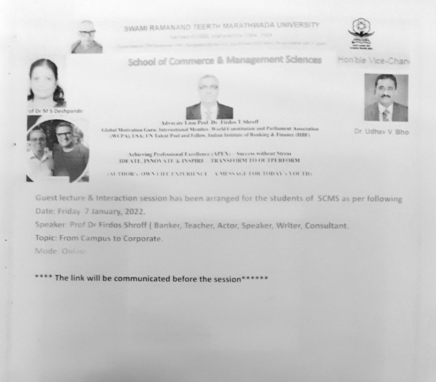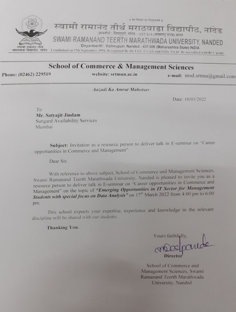 MBA programme of the School commenced from 1973-74 in the sub-centre of Marathwada University, Aurangabad. The department was then nurtured as Campus School of Commerce and Management Sciences of SRTM University, Nanded from 1994 onwards. Along with Master of Business Administration, the programme which has AICTE recognition from 2005 onwards continuously; our School offers Master of Commerce and Ph.D. programmes in Commerce as well as Management science.